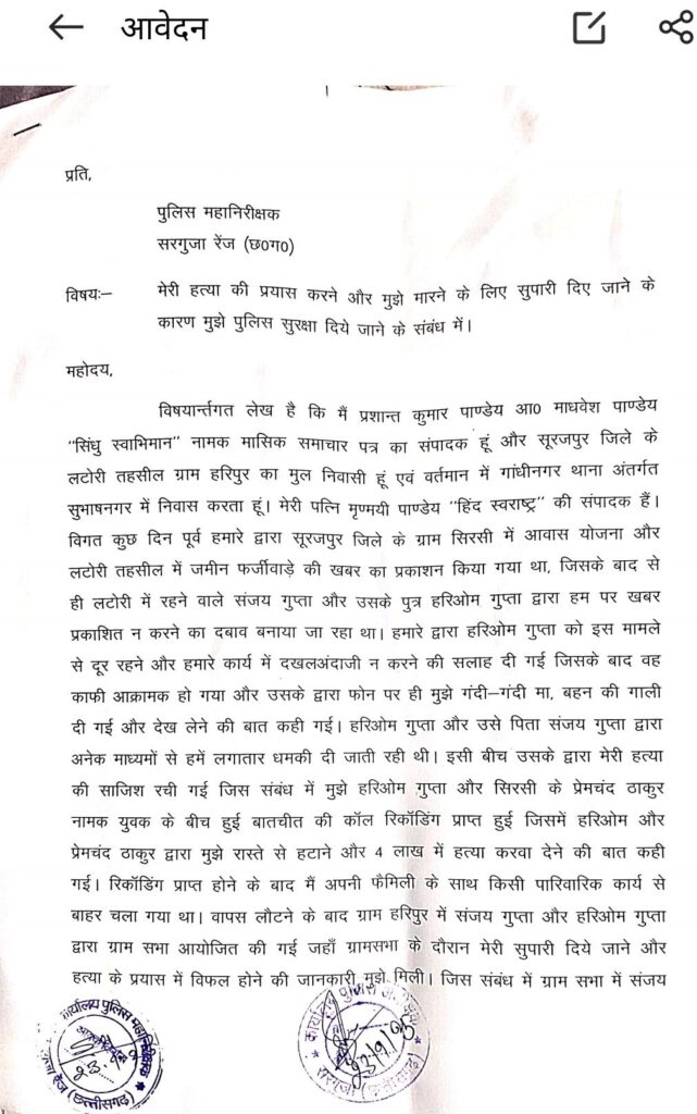 लगातार मिल रही धमकियों और असफल हत्या प्रयासों से डरे संपादक ने आईजी सरगुजा रेंज को सबूतों सहित शिकायत सौंपकर सुरक्षा और दोषियों पर कड़ी कार्रवाई की मांग की है।